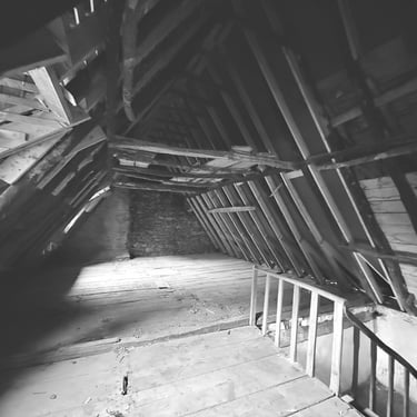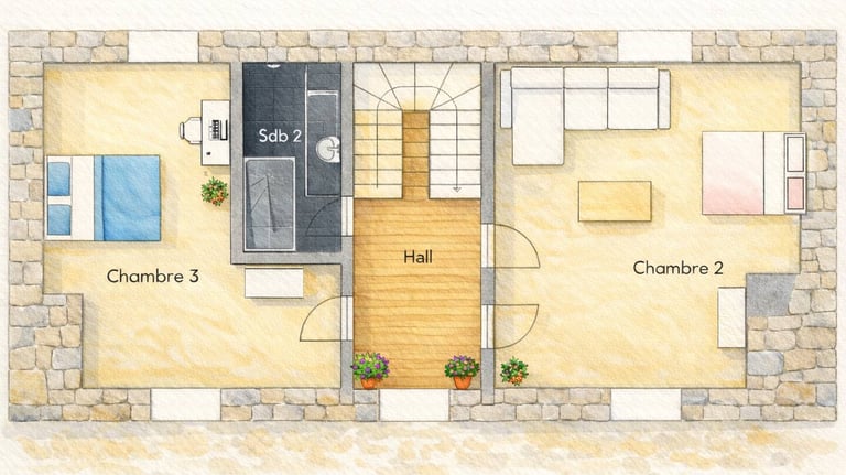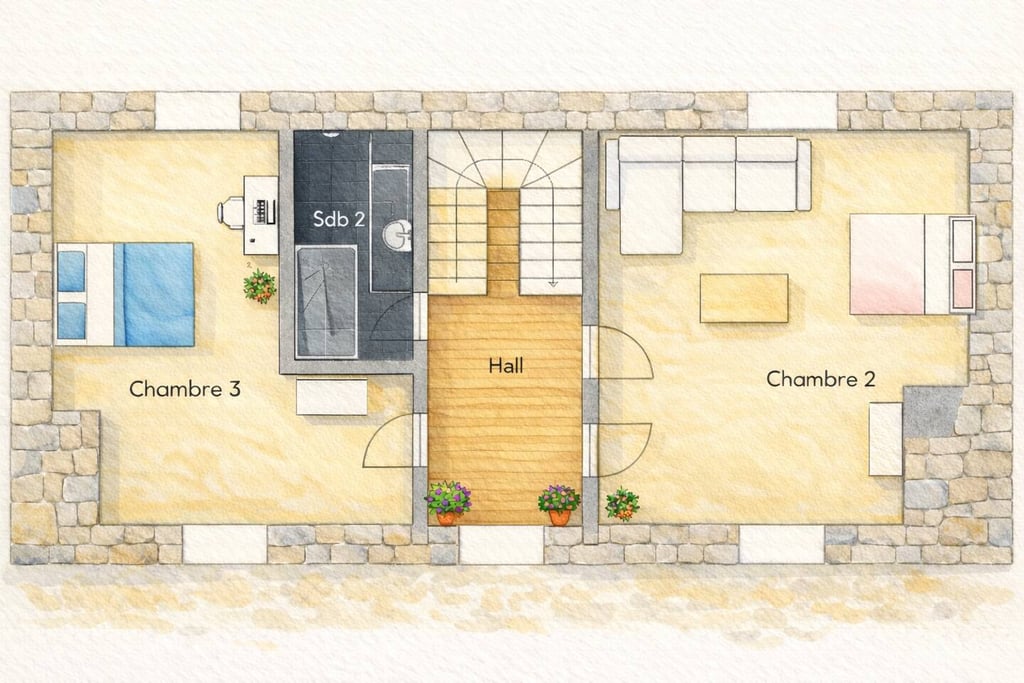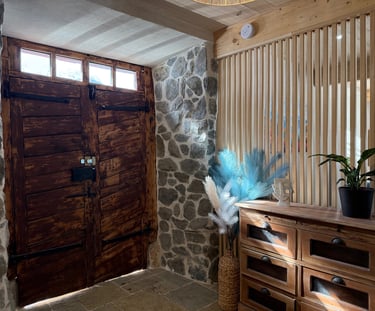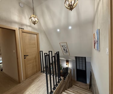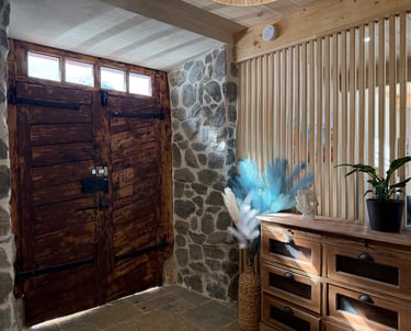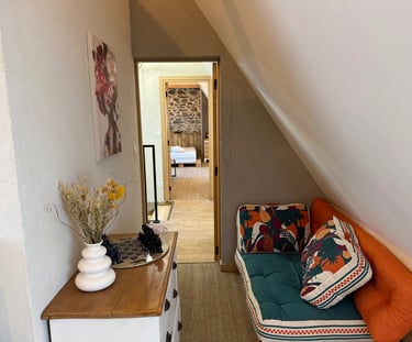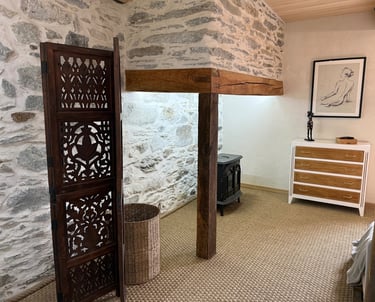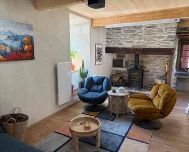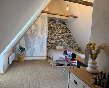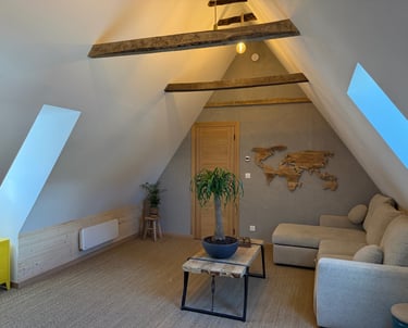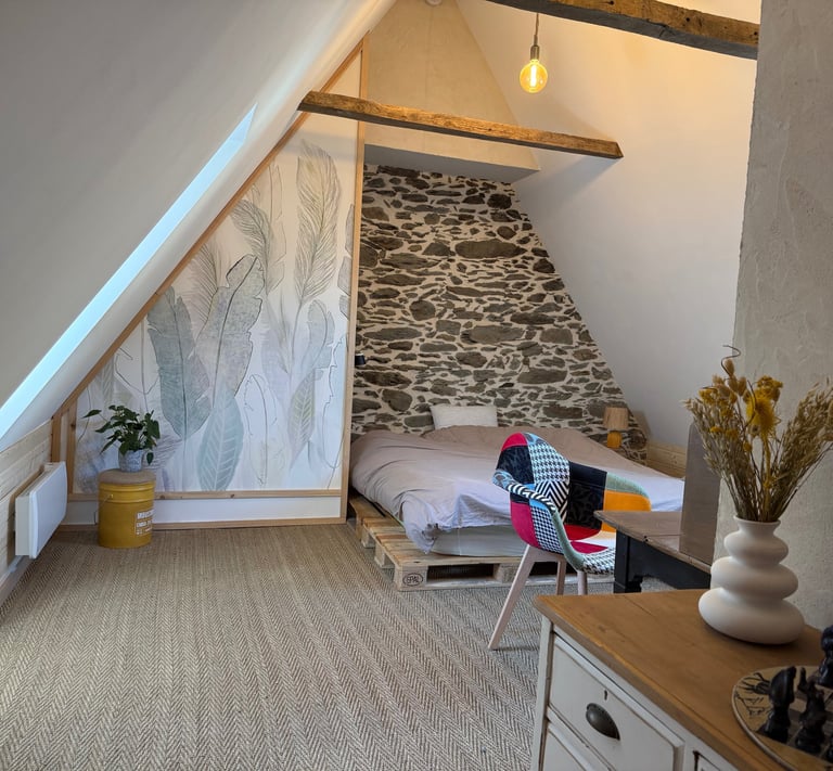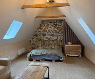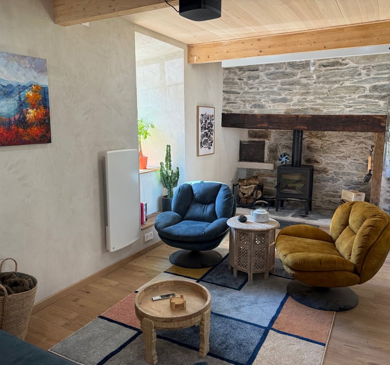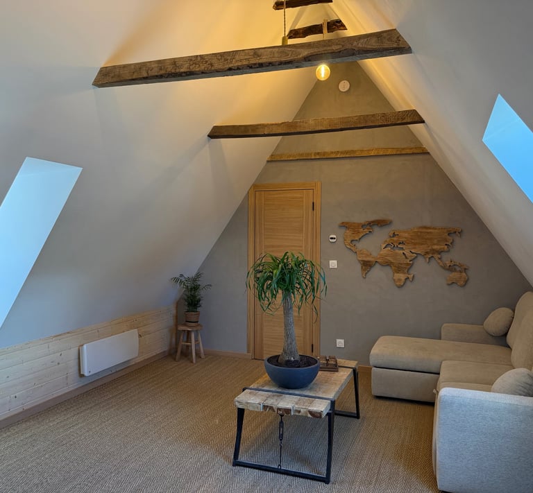 En levant les yeux, vous remarquerez les poutres de la charpente — elles ont environ 200 ans. On a tenu à les garder apparentes. Elles font partie de l'âme de la maison.